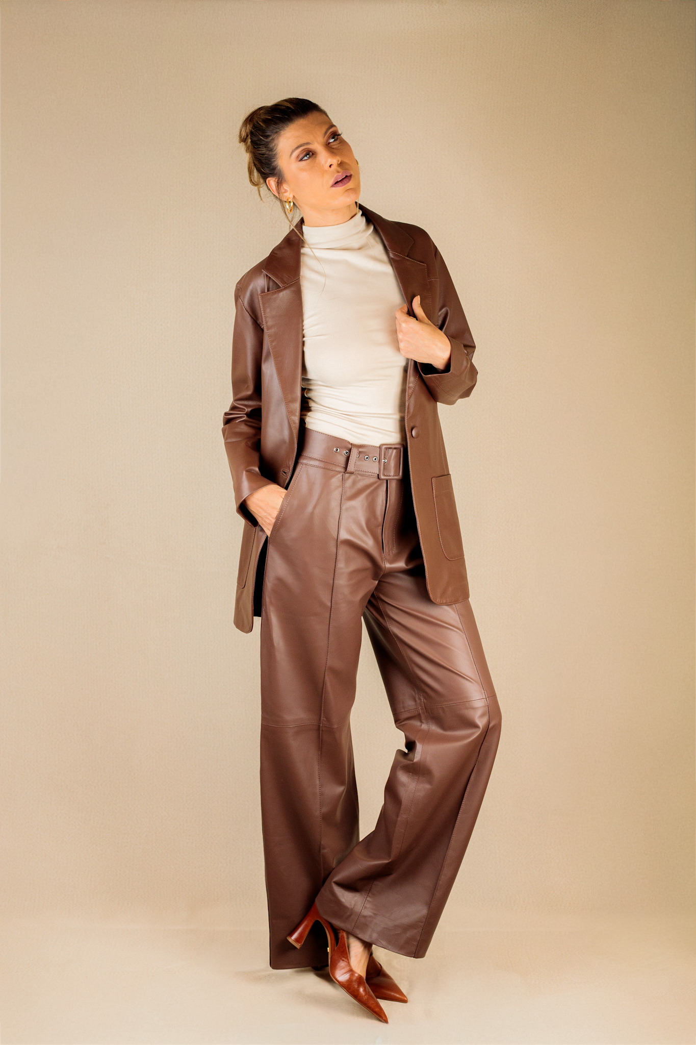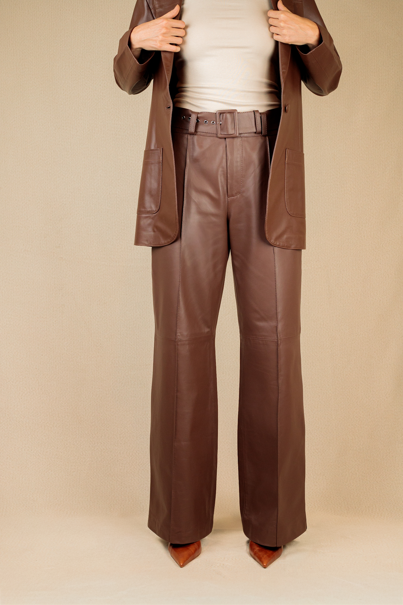 Calça pantalona com modelagem reta. A peça bolsos frontais. Cor: Chocolate Modelo veste: M