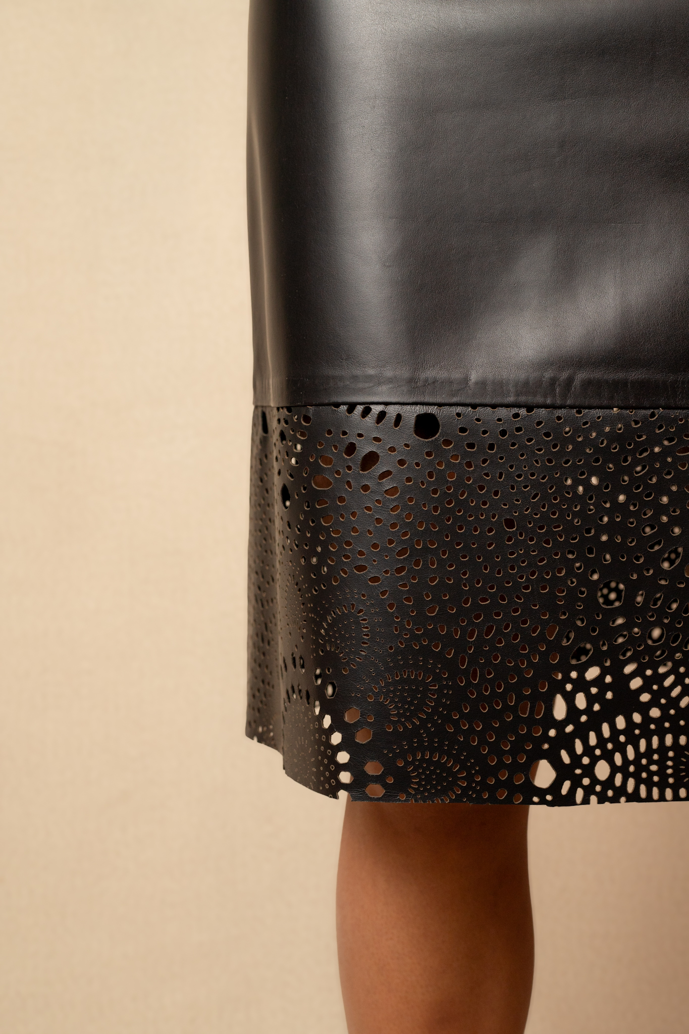 Modelagem reta abaixo do joelho Barra com recorte vazado (efeito renda) em couro Fenda discreta na lateral