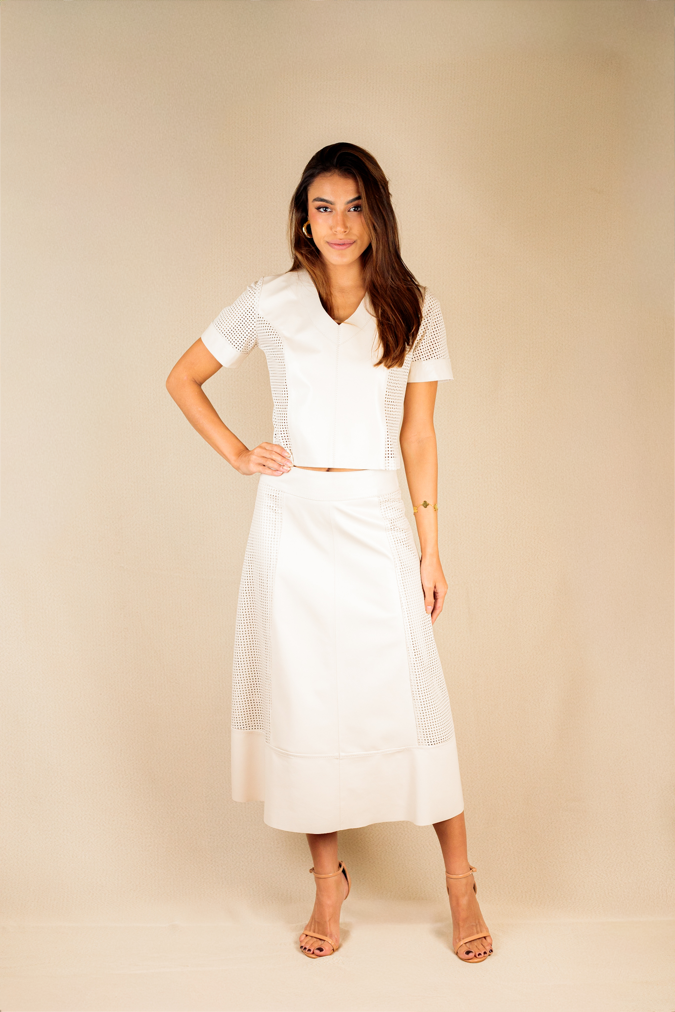 Blusa Cropped Manga Curta com Recortes Perfurados Decote V Saia com Modelagem midi, com comprimento alongado Recortes laterais perfurados, trazendo textura e sofisticação Levemente Godê Modelo veste: M/38 Cor: Off White